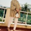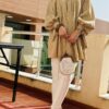 Tunique en tissu froissée , une découpe drapée , manches volumineuses , détaille d’un noeud au niveau de poignet . Une fermeture éclaire sur le dos