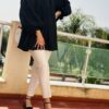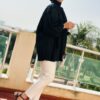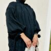 Tunique en tissu froissée , une découpe drapée , manches volumineuses , détaille d’un noeud au niveau de poignet . Une fermeture éclaire sur le dos